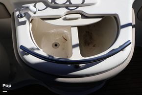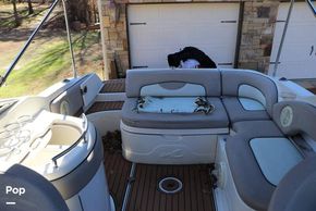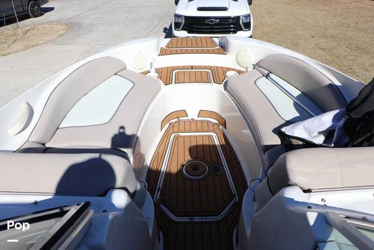The layout of this deck boat features a cockpit sink, a head with a sink, and a cuddy cabin located in front of the helm, providing space for someone to escape the sun and take a nap during the day on the lake.
