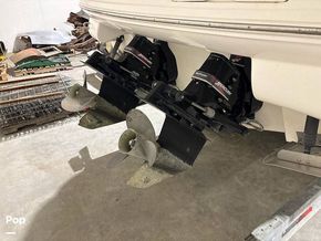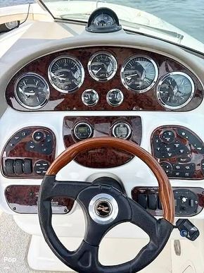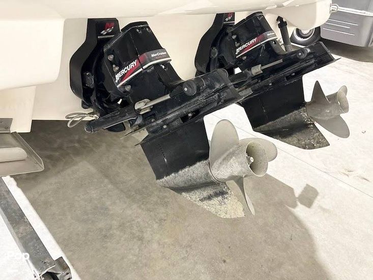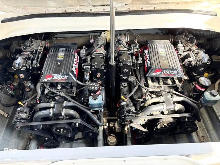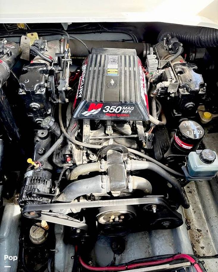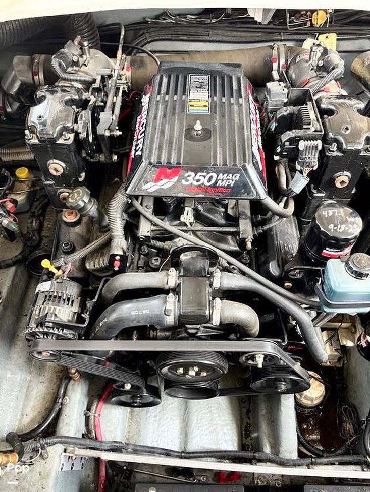 The ship is powered by twin Mercruiser 350 MAG MPI engines producing a total of 600 HP. Put the throttle down and hang on. This big boat powers at speeds of over 40 MPH.